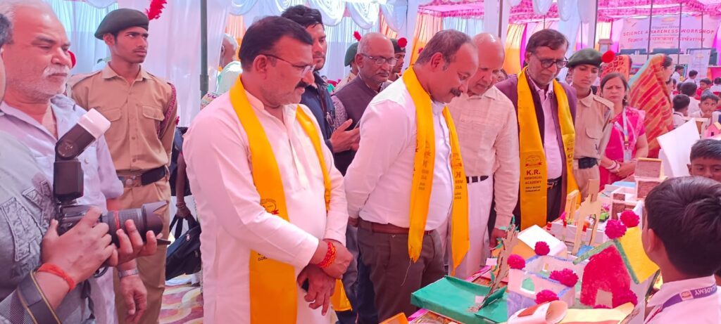 program का शानदार आगाज़: सरस्वती वंदना से शुरू हुई विज्ञान प्रदर्शनी। गोरखपुर के गोला क्षेत्र में स्थित सुरदापार राजा गांव के के आर मेमोरियल एकेडमी पर शनिवार को राष्ट्रीय विज्ञान दिवस के अवसर पर ‘जानो तो मानो’ थीम पर विज्ञान प्रदर्शनी और जागरूकता कार्यक्रम का भव्य आयोजन किया गया। कार्यक्रम का शुभारंभ मां सरस्वती के चित्र पर माल्यार्पण और दीप प्रज्वलन से हुआ। विद्यालय की छात्राओं ने सरस्वती वंदना और स्वागत गान की मनमोहक प्रस्तुति देकर सभी का दिल जीत लिया। कक्षा एलकेजी से इंटरमीडिएट तक के बच्चों ने उत्साहपूर्वक भाग लिया।