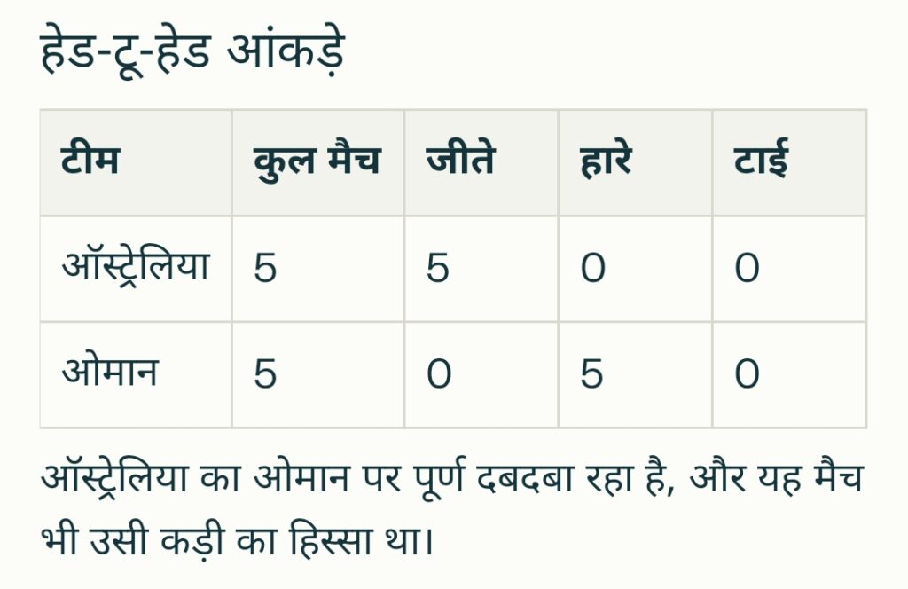 ऑस्ट्रेलिया ने टॉस जीतकर पहले बल्लेबाजी करते हुए मजबूत स्कोर बनाया, जिसमें उनके ओपनर्स ने आक्रामक शुरुआत की। ओमान की गेंदबाजी ने शुरुआत में अच्छा प्रयास किया, लेकिन मध्य ओवरों में विकेट चटकाने में नाकाम रही। ऑस्ट्रेलिया के कप्तान और स्टार बल्लेबाजों ने शानदार पारियां खेलीं, जिससे ओमान के सामने 180+ रनों का लक्ष्य रखा गया। ओमान की बल्लेबाजी जल्दी सिमट गई, और वे लक्ष्य से 50+ रन पीछे रह गए।