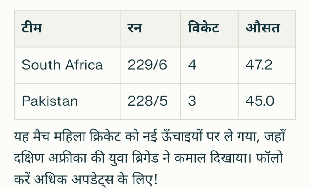 दक्षिण अफ्रीका महिला टीम ने लक्ष्य का पीछा करते हुए 47.2 ओवर्स में 6 विकेट खोकर 229 रन बनाकर 6 विकेट से जीत हासिल की। कप्तान स्मृति मंधाना ने नहीं, बल्कि लॉरेन बेली ने 85 रनों की नाबाद पारी खेली, जिसमें 8 चौके और 3 छक्के शामिल थे। पाकिस्तान की स्पिनर सादिया इकबाल ने 2/45 लेकर संघर्ष किया, लेकिन मरिज्के कैप ने 42 रनों के साथ अहम साझेदारी की। SAW vs PAKW live score में अंतिम 10 ओवर्स में साउथ अफ्रीका ने 92 रन ठोके, जो उनकी मजबूत डेथ बॉलिंग का कमाल था। इस जीत से दक्षिण अफ्रीका पॉइंट्स टेबल में टॉप पर पहुँच गई, जबकि पाकिस्तान को सेमीफाइनल की दौड़ से बाहर होना पड़ा।