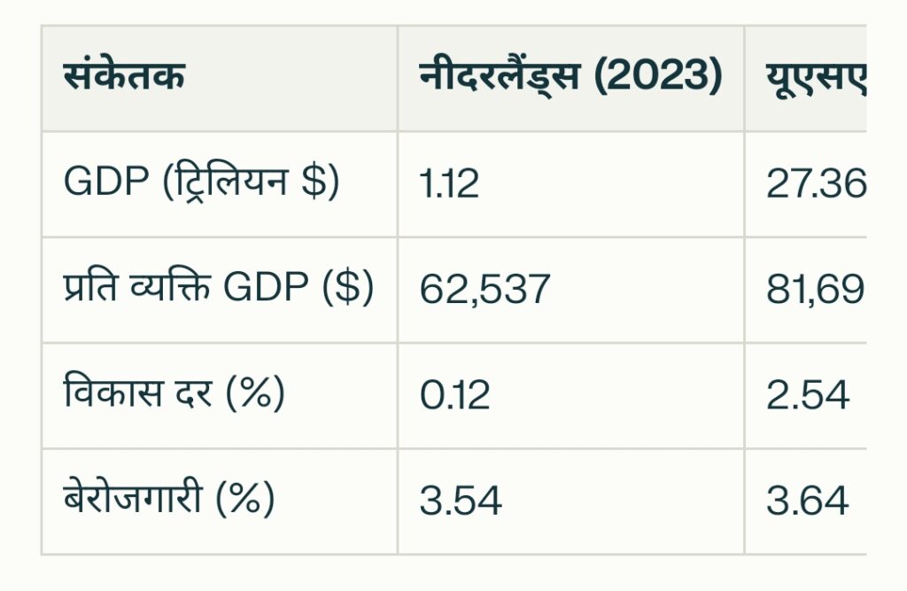 यूएसए का GDP 2023 में 27.36 ट्रिलियन डॉलर रहा, जो नीदरलैंड्स के 1.12 ट्रिलियन से 24 गुना अधिक है। हालांकि, प्रति व्यक्ति GDP में यूएसए (81,695 डॉलर) नीदरलैंड्स (62,537 डॉलर) से आगे है। विकास दर में यूएसए 2.54% के साथ नीदरलैंड्स (0.12%) को मात देता है।